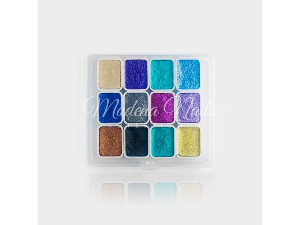 Sada akvarelových barev Sada 12 kusů akvarelových barev nezbytných k vytvoření jemných akvarelových dekorací Akvarelové barvy Modena Nails jsou perleťové a umožňují vytvářet vzdušné dekorace, jako jsou: jemné květiny, mramorové efekty a bubliny, které se jemně kovově třpytí. Užijte si radost z vytváření jedinečného nail artu.