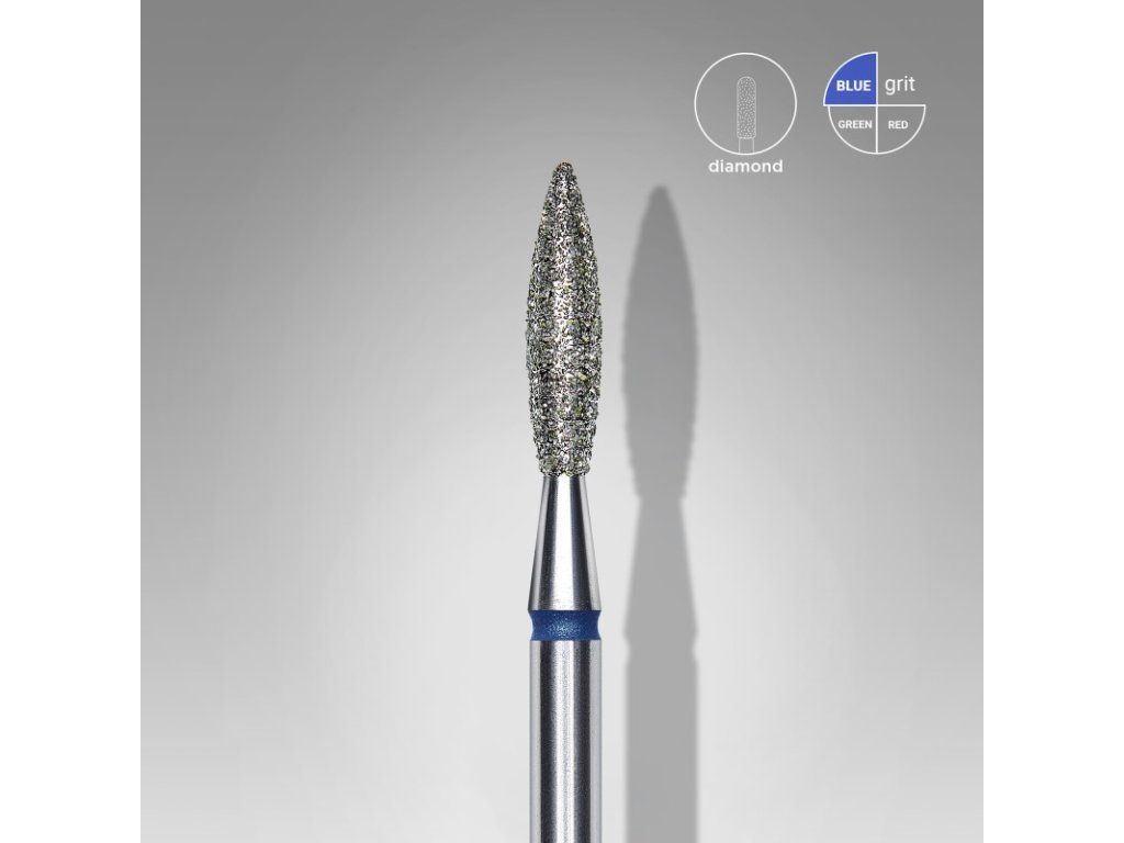 Staleks Diamantový brusný nástavec-"flame" blue 2,3mm/10mm -FA10B023/10 je diamantový nástavec se střední zrnitostí ve tvaru plamene o průměru 2,3mm a délce pracovní části 10mm. Díky speciálnímu způsobu nanášení diamantového písku je pracovní část nástavce hladká a bez nebezpečných výčnělků. Vhodný pro úpravu drsnější nehtové kutikuly a kůže, zvednutí a odstraňování kutikuly. Vyrobeno z vysoce kvalitní nerezavějící oceli.